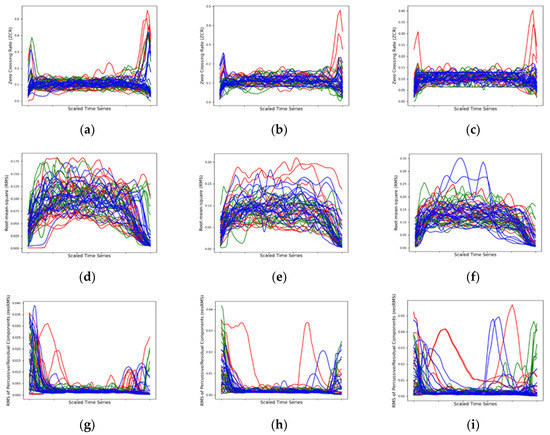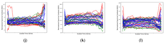 Time-varying descriptions registers for ZCR ((a) low, (b) mid, (c) high); RMS ((d) low, (e) mid, (f) high); resRMS ((g) low, (h) mid, (i) high); NSC ((j) low, (k) mid, (l) high). Red Line—Hawley appliance central incisors (HACI), Green Line—TEATA, Blue Line—Customized Splint. The time series of all plotted sounds were scaled on the x-axis to uniform duration.