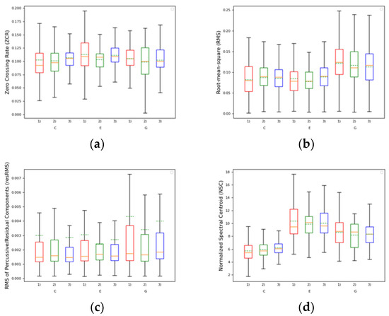 The time-varying descriptions in Figure 7a–c denote overall stability in the zero-crossing rate (ZCR) rate of the trumpet sound, namely during the sustain part of the trumpet note envelope. The trumpet envelope note’s attack and release have higher variance due most probably to typical noisy transients. To minimize transient noise data in the analysis, we adopt median and analysis.