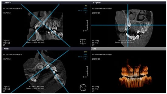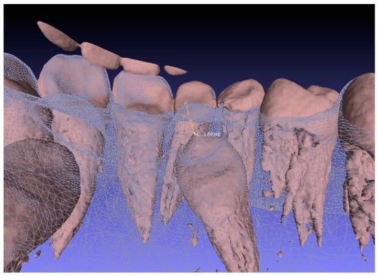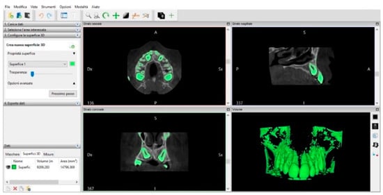 It is an open-source software for reconstruction of computed tomography and Magnetic Resonance Imaging []. The first step is to import CT files, then the range of values that corresponds to the radiopacity of the selected X-ray images that we want to be part of the three-dimensional model is chosen. At this point, a surface is generated, and it is obtained a 3D model in STL, which can be exported and meshed with the STL models of the intraoral scans.