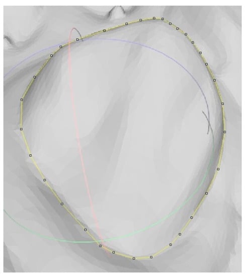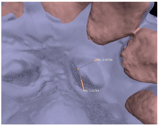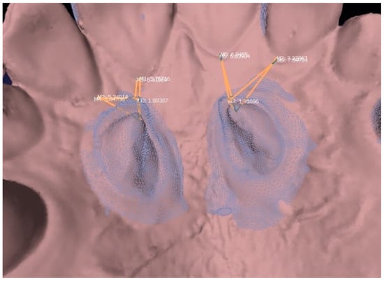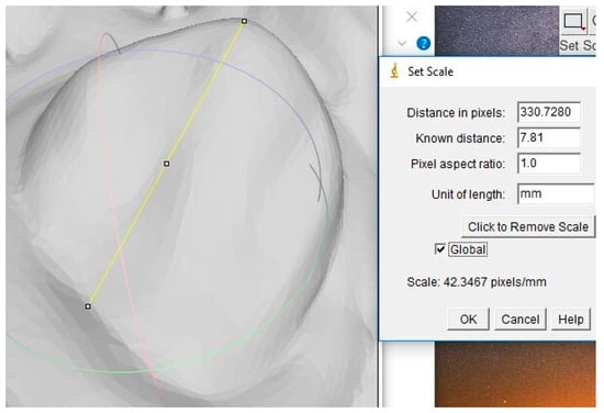 Then, the Image J program was used. It is an open-source image processing program, designed for scientific multidimensional images. It was possible to obtain the value of the palatal and vestibular areas of the erupting teeth at T1 and T2 by importing 2D images of the surfaces, created with MeshLab, on the program and inserting the maximum length values. The program measures the area of the surface contained in the perimeter, thanks to a pixel-mm conversion (Figure 6 and Figure 7).