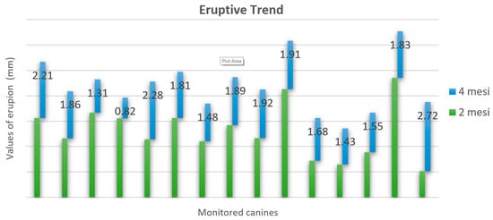 The T test suggests that the difference in eruption and exposure of the palatal and vestibular areas in the two periods considered (T0–T1, T1–T2) are statistically significant data, being the p-value lower than 0.05. The exposed palatal surface is always bigger than the vestibular one. The patients with larger exposed area had mucosal impaction of the canines. The exposure of the areas is always greater in the first two months, with an increase of the available surface of 40% in the last 2 months.