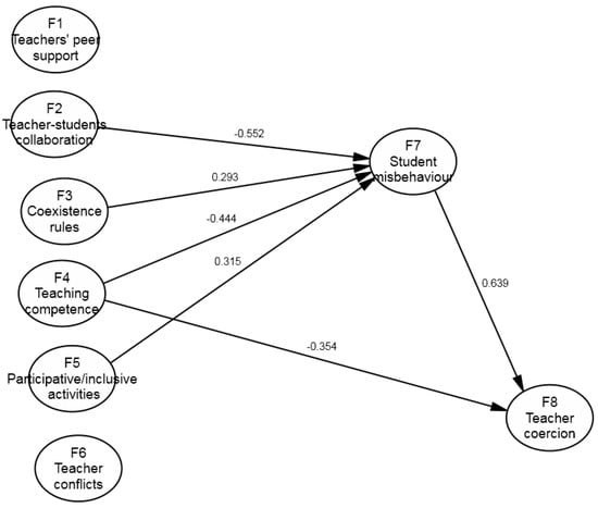 This model considers that teacher coercion (F8) is determined as mainly based on student misbehaviour with teachers, and this weight is not different in the two subsamples (β secondary = 0.583, p < 0.001); β primary = 0.639, p < 0.001). Certain differences appear in the other predictors: for instance, the large weight observed for primary education teacher competence (β = −0.354, p < 0.001) was not relevant for secondary education (β = 0.010, p = 0.937). For secondary education, however, we found that two other predictors influenced teacher coercion with students: performing inclusive activities in classrooms (β = −0.276, p = 0.007), and perceiving that rules worked (β = 0.207, p = 0.034), both of which were not significant variables in the primary education group.