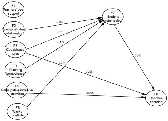 For the purpose of making intergroup comparisons (i.e., between two levels of education—primary versus secondary), we first obtained correlations among all the factor scores of the variables in both the Primary and Secondary Education teacher subsample. Then we made a comparison between them using Fisher’s Z transformation of the correlation coefficient. An SEM model was subsequently considered [47,51], which, along with the measurement models, added the possibility of establishing relations between variables by defining exogenous variables as the independent variables and endogenous variables as the dependent variables. In the same model, all of the exogenous variables were related to the endogenous variables, except for F1 (teachers’ perceived peer support) on F8 (teacher coercion), whose correlation was not significant in both the primary education and secondary education teacher subsamples. As pointed out in the theoretical framework, this model established that F7 (student misbehaviour) was an antecedent of F8 (teacher coercion). Thus, the endogenous variables could exert indirect effects on teacher coercion via student misbehaviour (Figure 1). Various models were compared with this model, distinct restrictions were determined for the equality of regression weights, and the measurement model of the latent variables remained stable.