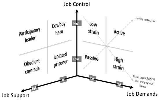 Karasek and colleagues postulated two main hypotheses concerning the link between these constellations, well-being/health and learning outcomes [3,7]. The first one, the strain hypothesis, suggests that high strain jobs (characterized by high job demands and low job control) predict workers’ ill-being (see Figure 1). More generally, authors suggested that jobs characterized by high job demands are expected to have a negative effect on workers’ health. Furthermore, according to the JDCS model, “iso-strain jobs” (characterized by high job demands, low job control, and low social support) expose workers to the highest risk of poor psychological wellbeing and ill-health [3,8]. As for passive and low-strain jobs, as those jobs imply limited challenges and opportunities from work, the model postulates that these jobs may expose workers to moderate or low levels of wellbeing [1]. Increasing job demands and decreasing job control (and job support) would then underlie this hypothesis, which would be related to an increase in strains and several indicators of ill-health [9]. The second main hypothesis concerns the learning hypothesis [1], suggesting that high job demands together with high job control predict higher levels of work motivation, learning, skill development, and increased personal growth at work. In this sense, active jobs (high job demands and high job control) may promote learning, motivation, and personal growth at work. In the “learning hypothesis”, the assumption is that high job demands and high job control promote both activation and learning. In this sense, Karasek suggested that activation and learning should be considered as “an increase in overall activity and in general problem-solving activity” [1] (p. 288).