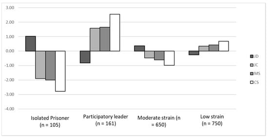 Profile 1 represents 6.3% (n = 105) of the sample (latent profile membership probability = 0.83) and it is characterized by very high job demands, very low control, very low managerial support, and very low coworkers’ support (Figure 3). Thus, following the JDCS theorization, this profile was labelled as Isolated Prisoner. Profile 2 represents 9.6% (n = 161) of the sample (latent profile membership probability = 0.82) and is characterized by low job demands, high job control, high managerial support, and high coworkers’ support. Thus, following the JDCS theorization, this profile was labelled as Participatory Leader. Profile 3 represents 38.9% (n = 650) of the sample (latent profile membership probability = 0.81) and is characterized by slightly above average levels of job demands, slightly below average levels of job control, low managerial support, and low peer support. Thus, this profile was labelled as Moderate Strain. Finally, profile 4 represents 45.2% (n = 750) of the sample (latent profile membership probability = 0.84) and is characterized by slightly below average levels of job demands, slightly above levels of job control, moderate managerial support, and moderate peer support. Thus, this profile was labelled as Low Strain.