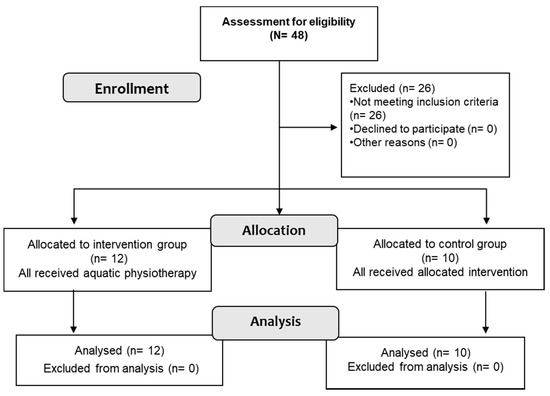 A quasi-experimental trial was carried out, with participants recruited from the Hospital after ethical approval. First, the volunteers filled in a sociodemographic data and health condition questionnaire, the disability arm shoulder and hand (DASH) scale and signed the informed consent. An expert physiotherapist performed a fixed protocol of aquatic therapeutic exercises each session. Three physiotherapists performed the measures: Stadiometer scale, balance weighing scale, visual analogic scale for pain (VAS_Pain), step test (ST), functional reach test (FRT), and the global balance standing test (GBST), before and no more than 2 min after the intervention. The control group without aquatic therapy intervention followed the same procedure, with measurements taken before and after 45 min of a rest period in a chair. The study design and reporting follow the CONSORT recommendations for conduction and reporting. This was not a randomized controlled trial [22].