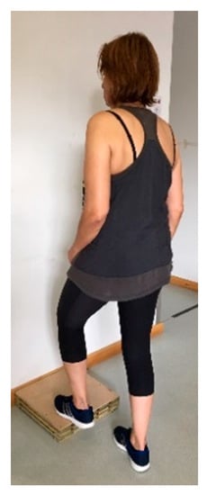 The ST is a test of dynamic balance. The users were instructed to stand in front of a step 7.5 cm high without support while simulating the ascent and descent of stairs alternately on the right and left foot (Figure 2). Complete repetitions were counted during 15 s [39]. The mean values of three trials were recorded. The speed of performance in the step movement provided a significant prediction of non-fallers with a success rate of 70%. Seven or less steps in 15 s suggested high instability [15].