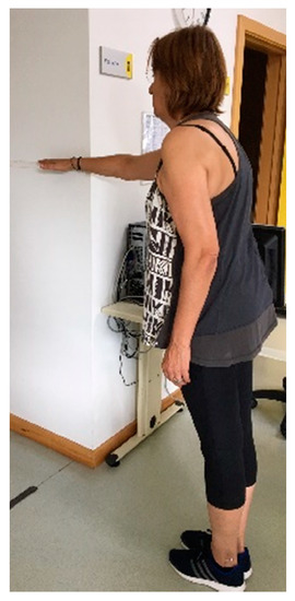 The FRT is a test that evaluates the frontal dynamic balance. The patient must be able to stand independently for at least 30 s without support and also be able to flex the shoulder to at least 90° (Figure 3). The participant was instructed to stand next to a wall so that he can reach forward along the length of the metric stick as far as possible. The movement is repeated three times and the evaluator measures the distance achieved in centimeters [40]. The mean of the second and third attempt is recorded. The performance in FRT should be between 15 and 25 cm to be considered as a safe frontal dynamic balance [41].