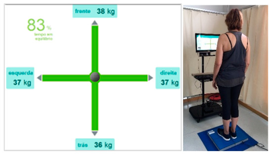 The GBST on the force platform (Hercules model from Sensing Future, 60 × 48 × 45 cm), used Wi-Fi to monitor communication, acquisition frequency until 100 Hz, and software (from Sensing Future) to evaluate the static balance with biofeedback in the computer monitor, using a red and green cross as an indicator of bad or good equilibrium, respectively [42]. The equation for calculating the percentage in equilibrium is as follows: