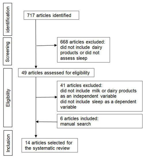 PubMed database searches identified 717 studies. Of these, 668 were excluded based on their titles since they were considered irrelevant to the topic of interest (first screening). After reading the abstracts of the identified reports, the following studies were selected: (1) those with milk product consumption as independent variable and (2) those with sleep variables as dependent variables (second screening). Three authors (TK, IO, and YK) confirmed and discussed the articles’ content (third screening). Eight of these met all the criteria for the systematic review [12,13,14,15,16,17,18,19]. Additional studies were manually identified through other sources (n = 6) [20,21,22,23,24,25]. The reasons for the inclusion/exclusion of studies are shown in Figure 1.