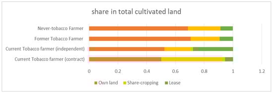 While the proportion of cultivation in own land is similar (50% vs. 52%) between the contract and independent tobacco farmers, some noticeable variations exist in the proportion of land under sharecropping (44% vs. 20%) and cultivation with lease (5.57% vs. 28%) between these two groups (Figure 1). The share of own land is larger among never and former tobacco farmers than current tobacco farmers, which may indicate that tobacco farmers prefer to lease land or have recourse to share cropping for tobacco cultivation considering the adverse effect of tobacco cultivation on the soil quality and productivity of land.