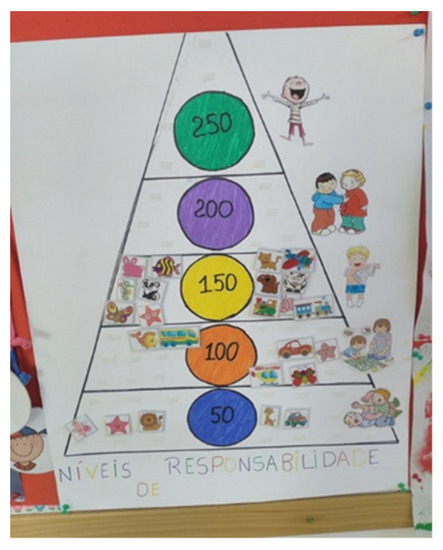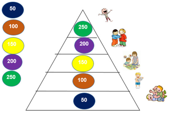 The TPSR-based program was conducted between September 2017 and December 2018 and followed Hellison’s [7] pedagogical principles and structure proposed for PE sessions. This program was based on previous research conducted by Pavão et al. [11], who created the ‘Early Start To Approaching Responsibility—ESTAR’ program. Expanding on these two components, an empowerment-based climate was promoted by the program leader, as children had the chance to stand in front of class, become a line leader and the leader of the day, as well as help others share materials, and suggest activities, rules, and/or goals. In addition, children were actively involved in the assessment of responsibility behaviors, shared their thoughts with the remaining class, and daily rated their overall performance towards a responsibility goal in a scoreboard placed in the classroom. Responsibility behaviors included respecting others, engaging in activities, and making decisions (see Table 1 for examples of responsibility behaviors). More specifically, after each PE session, children would place their photo on the level of responsibility they thought needed to further develop in future sessions. Children were engaged in this process by suggesting the number of points that should be awarded by the program leader (see Figure 1 and Figure 2 for Hellison’s levels of responsibility and rewards given to children). At the end of the week, a “ceremony” took place to provide feedback on children’s accomplishments. A key difference from traditional TPSR programs was the language used to communicate responsibility goals and desired behaviors. Visual aids and examples were used to reflect the contents of the program in consideration of children’s cognitive and language development. Teacher–student relationships were fostered through individual conversations and frequent interactions with all children. With regards to transference, a “responsibility card” (see Figure 3) was used once a week to communicate with parents, and included a pyramid with Hellison’s responsibility levels, the responsibility objectives developed that week, and two at-home activities (e.g., could you tell your mother/father about the activity you did today in PE?). The final part of the “responsibility card” included a section for parents to provide feedback on how the activities were conducted, and future suggestions. All these adaptations were based on recommendations in the literature [10] and considered children’s needs, cognitive competence, and the Portuguese PE curriculum. To assess model fidelity, several procedures were conducted [7,13]. First, a TPSR implementation checklist was filled out by the program leader after each session, based on TPSR goals. Two sessions were observed by one of the co-authors that also used the TPSR implementation checklist. Second, an expert on the TSPR model, with more than 20 years of experience, served as an external consultant, monitored model implementation, and provided suggestions and adaptations needed to increase model fidelity.