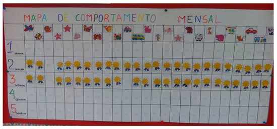 Responsibility board with children’s accomplishments per week represented by a stamp.
