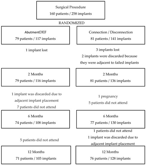 Table 1). No statistically significant differences were found between the placement of the definitive abutment on the day of surgery without being removed at any other time or following the concept “One Abutment—One Time”, compared to the conventional prosthetic procedure in which the healing screw is removed at least three times. The evolution of the peri-implant bone level is similar in both groups, presenting the greatest loss in the first 6 months, with bone loss being stable in the two groups between 6 and 12 months (
