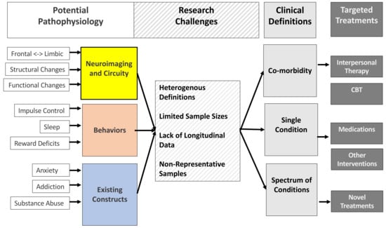 Synthesis of potential underpinning processes, risk factors, and treatments of internet usage disorders, along with contemporary challenges faced by current research within this area. The Targeted Treatments “CBT” box also includes internet-delivered cognitive behavioural therapy (termed iCBT) [28].