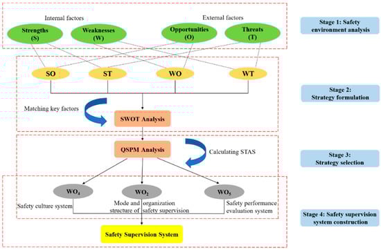 The SWOT analysis is an effective structured planning method used in the case of strategy formulation. Key pieces of information obtained from the EFEM and IFEM analyses were grouped into two main categories: strengths and weaknesses within the internal safety environment, and opportunities and threats within the external safety environment. As Table 4 shows, seemingly independent key factors were systematically considered, matched, and analyzed to enable the development of alternative safety supervision strategies.