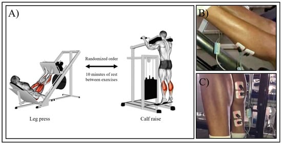 Illustration of exercise testing procedure (A), and electrode position during leg press (B) and calf raise (C).