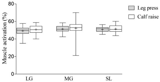 Comparison of muscle activation between leg press and calf raise. LG, lateral gastrocnemius; MG, medial gastrocnemius; SL, soleus. Values are presented as median (lines) with interquartile range (boxes) ± range (minimum and maximum) and + indicates mean.