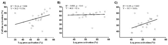 Correlation between calf raise and leg press mean EMG for the lateralis gastrocnemius (A), the medialis gastrocnemius (B), and the soleus (C).