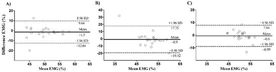 There is a significant correlation between the leg press and calf raise mean EMG for the lateral gastrocnemius (p = 0.04) and the soleus (p = 0.02), but not for the medialis gastrocnemius (p = 0.41) (Figure 3). The Bland–Altman plot showed systematic bias of −1.5 ± 5.7, −0.9 ± 9.5 and −0.6 ± 4.3 for the lateral, medial gastrocnemius, and soleus, respectively (Figure 4). The presence of proportional bias was verified for the medial gastrocnemius (p < 0.01), but not for the lateral gastrocnemius (p = 0.84) and soleus (p = 0.50).