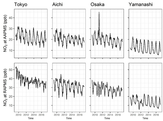 Among the four study areas, Tokyo had the highest NO2 concentration both at AAPMS and RAPMS, and Yamanashi has the lowest (Table 1 and Figure 1). The dynamics of NO2 had annual seasonality showing the highest/lowest concentrations in summer (August)/winter (basically November–February), respectively; however, the seasonality at RAPMS was less clear than that at AAPMS (Table 1).