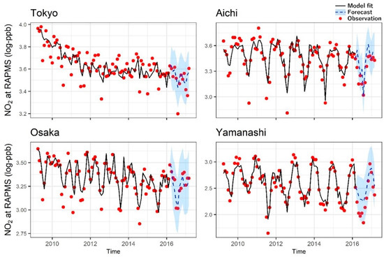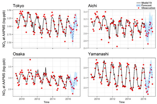 Specifically, air temperature had significant negative associations with NO2 in all the prefectures except Yamanashi. Wind speed had negative associations with NO2 in all the prefectures. Solar radiation had negative associations with NO2 in all the prefectures except Osaka. O3 was negatively and significantly associated with NO2 only in Yamanashi. NO had positive associations with NO2 in all the prefectures. The associations of relative humidity and sunshine duration with NO2 did not have consistent trends by prefecture (Table 2). Humidity in Osaka was negatively associated with NO2 while that in Yamanashi was positively associated. Sunshine duration had a trend of negative association with NO2 except in Osaka; Yamanashi had a significant negative association, while Osaka had a positive association. RMSEs for forecasting were close to those for model fitting (Table S2), and most of the testing data were within the 95% confidence interval (CI) of the forecasting (see Figure 2 as examples).