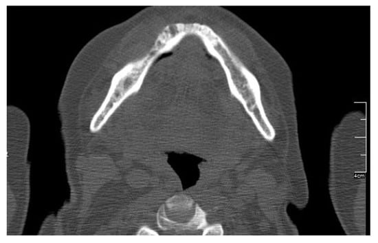 Computed tomography showing mandibular medication-related osteonecrosis of the jaw.