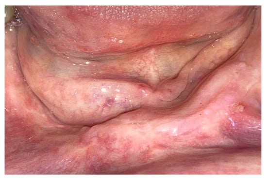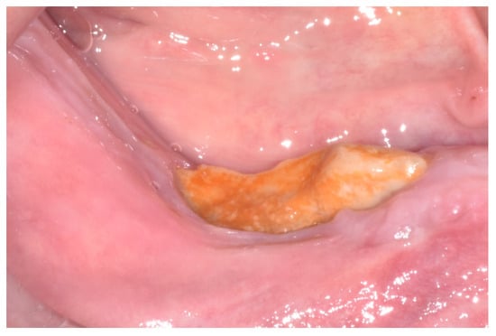 All MRONJ stages except for stage IIIa were included: stage Ia (n = 1), Ib (n = 2), stage IIa (n = 1), IIb (n = 1) and stage III b (n = 1). The comparative assessment with this group of patients showed a similar distribution of MRONJ stages ranged between Ia (n = 1), Ib (n = 3), IIa (n = 2), IIb (n = 5) and IIIb (n = 5). The adopted therapeutic strategies have been reported for patients taking CDK4/6 inhibitors and for other cancer patients of the cohort as well. In total, 10 patients were eligible for surgical treatment (Figure 1, Figure 2, Figure 3, Figure 4, Figure 5, Figure 6 and Figure 7) whereas for 6 patients, surgery was contraindicated, and disease control was obtained through medical treatment only.