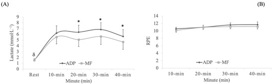 Blood lactate levels (A) and rating of perceived exertion (RPE) (B) during aerobic dance sessions. * Significantly different from marble floor at times 20-min, 30-min and 40-min, p ≤ 0.01. Data are provided as mean and 95% confidence intervals (95% CI). δ Significantly different from checkpoint at times10-min, 20-min, 30-min and 40-min in both experimental conditions, p < 0.001. Abbreviations used: ADP = air dissipation platform; MF = marble floor (hard surface).