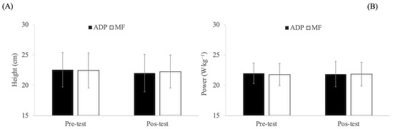 Muscular fatigue assessed by countermovement jump (CMJ) test before and after the aerobic dance classes. (A) Mean height (cm) in CMJ. (B) Mean power (W·kg−1) in CMJ. No significant differences were detected among experimental conditions. Abbreviations used: ADP = air dissipation platform; MF = marble floor (hard surface).