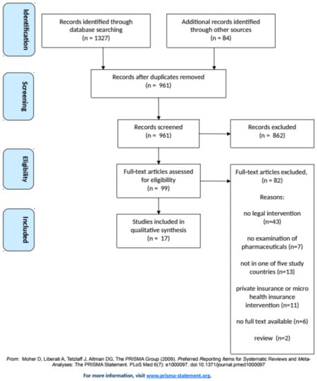 A total of 17 studies were identified for inclusion in the review. The search of Ovid Medline, Embase, Scopus, and Web of Science databases provided a total of 1327 citations (references). After including articles located from the grey literature and adjusting for duplicates 961 articles remained. Of these, 862 studies were discarded because they did not meet the inclusion criteria and the full text of 99 studies was assessed for eligibility. Of these, 82 articles were excluded because the design did not evaluate a legal intervention (n = 43), the study did not specifically examine pharmaceuticals (n = 7), the setting was not in one of the five study countries (n = 13), the study concerned private insurance or micro health insurance (n = 11), no full text was available (n = 6), or the articles were reviews or summaries of original research already included in screening (n = 2). Seventeen studies were included in the review. Figure 1 illustrates the inclusion process. Table 4 summarises the studies’ designs, legal interventions, study populations and data sources, and main outcome measures and results. Supplementary Material S2 presents the search results.