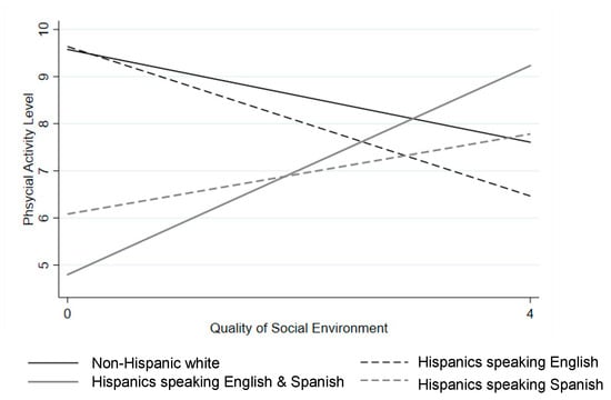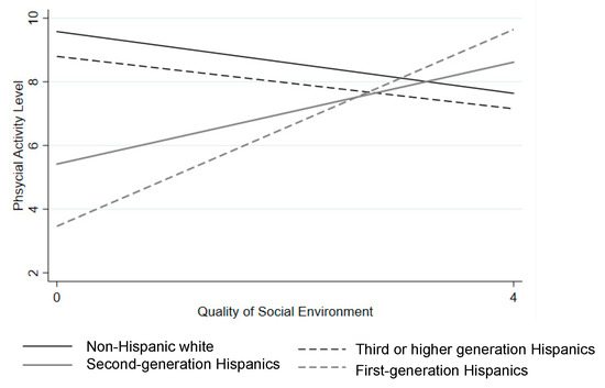Cultural factors may interact with social environments to affect child physical activity although to our knowledge, no empirical research has investigated its interaction effect. Past literature showed variation across Hispanic immigrant generations in types of resources that parents use to support their children. For example, parents of first-generation Hispanic children used informal support for their children, while parents of third-generation Hispanic children used formal and structural support for their children [29]. Living in a high-quality social environment may be an important informal support for Spanish-speaking Hispanic children and first- or second-generation Hispanic children. Safe and supportive environments may lead to more physical activity within the neighborhood thereby exposing them to visual cues of neighbors and peers being physically active in their neighborhood. Also, Spanish-speaking or first- or second-generation Hispanic families can face practical and cultural challenges to navigating and utilizing physical activity resources outside their neighborhood [21,30,31,32]. Thus, living in a health-promoting neighborhood may provide more beneficial informal support for them in comparison to non-Hispanic White children and Hispanic children from English-speaking or third-generation families who may be more likely to use formal and structural resources.