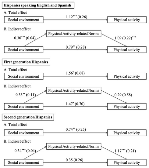 Finally, we tested the mediation of neighborhood physical activity-related social norms in the association between the social environment and physical activity. Before the mediation analysis was performed, we stratified the data by two cultural factors and tested the association between the social environment and physical activity in the stratified models. As previously reported, the association was significant in Hispanic children speaking English and Spanish, first-generation Hispanic children, and second-generation Hispanic children, but not in non-Hispanic White children, Hispanic children speaking English or Spanish, and third- or higher-generation Hispanic children. Thus, mediation analysis was performed in Hispanic children speaking English and Spanish, first-generation Hispanic children, and second-generation Hispanic children, separately. Table 6 and Figure 3 present the estimates of the effects of the social environment on physical activity. As shown in Table 6, the indirect effect estimates indicate a significant mediating role of neighborhood physical activity-related social norms for Hispanic children speaking English and Spanish (b = 0.33 [=0.30 × 1.09], p < 0.001) and second-generation Hispanic children (b = 0.40 [=0.34 × 1.17], p < 0.001). There was no significant mediation effect of neighborhood physical activity-related social norms for first-generation Hispanic children (b = 0.09[=0.33 × 0.29], p > 0.05).