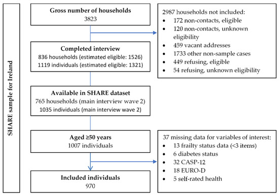 This cross-sectional study is a secondary analysis of data from wave two [26] of the Survey of Health, Ageing and Retirement in Europe (SHARE) for Ireland. It also includes longitudinal mortality data assessed at wave three [27]. The SHARE sampling frame was taken from the civil register of Ireland with the sampling unit being individual addresses including nursing homes [28]. This was conducted with the support of the Economic and Social Research Institute with main interviews conducted between February and December 2007 by 105 trained interviewers [29]. In total, computer assisted personal interviews were completed face to face with over 1000 participants. Further details of the methodology of the SHARE have been published elsewhere [30]. Details on the SHARE sample for Ireland including response rates are presented in Figure 1.