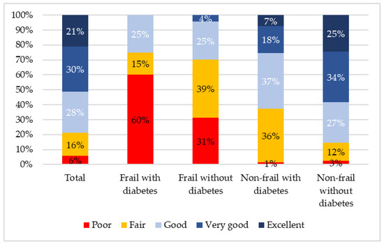 In this cohort, compared with those without diabetes, people with diabetes were more likely to be frail (23% vs. 8%; p < 0.001), have low SRH (46% vs. 19%; p < 0.001), depression (25% vs. 17%; p = 0.070) and low QoL (25% vs. 18%, p = 0.085). For participants with diabetes, 75% of those with frailty rated their health as low compared with 37% of non-frail participants (p = 0.003). For those without diabetes, the difference between frail and non-frail participants was 70% and 15% (p < 0.001). The five category differences in self-rated health are presented in Figure 2, illustrating that no one with frailty and diabetes rated their health as “excellent” or “very good” and the majority (60%) rated it as poor. These five category differences between participants who were frail and non-frail were highly statistically significant for both those with and without diabetes (p < 0.001). The difference between frail participants with and without diabetes was insignificant (p = 0.077).