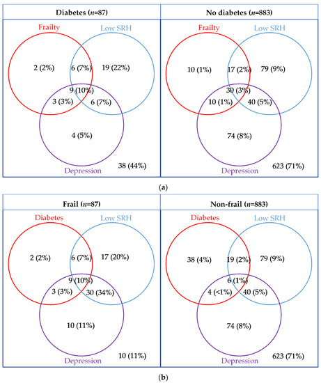 Venn diagrams presenting the overlap between diabetes or frailty, with depression (EURO-D ≥ 4), and low self-rated health (poor/fair) presented by (a) diabetes status and (b) frailty status.