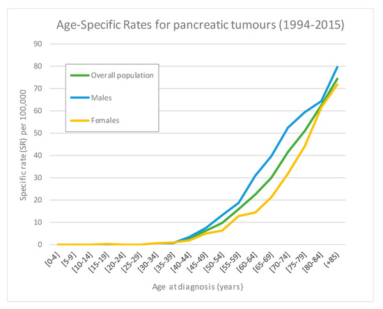 Age-specific incidence rates for pancreatic tumours of the overall population and according to sex.