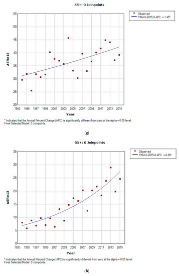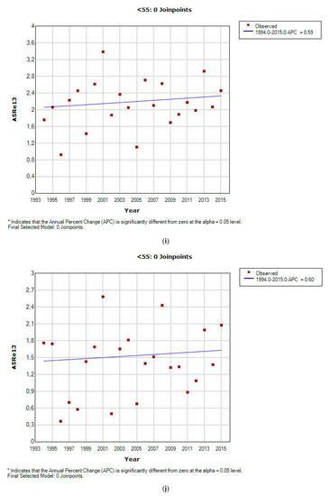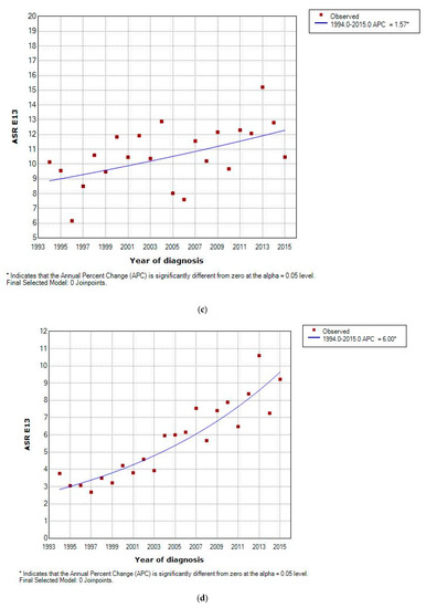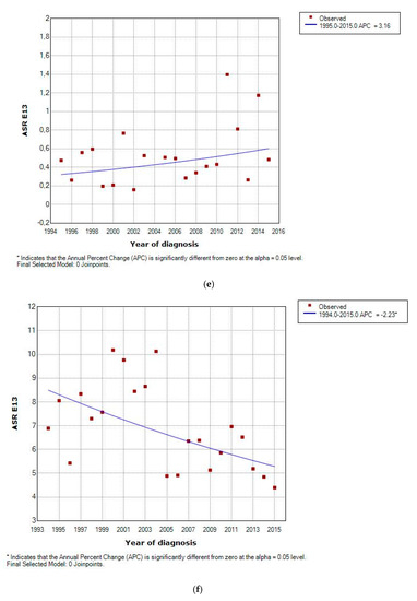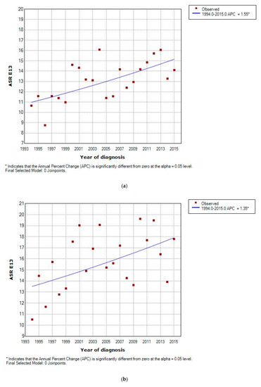 The overall CR for the whole series was 11.43 cases per 100,000 inhabitants/year. Compared with females, males had higher incidence rates: 12.17 versus 10.34, respectively. The overall ASRE13 was 13.19 (95% confidence interval (CI) 12.55; 13.85) and the ASRW was 5.68(95% CI 5.38; 6.01) (Table 2). Age-specific rates reflected an increase with advancing age, having the Girona population over 85 years the highest rate (74.5 cases per 100,000 inhabitants/year) (Figure 1). During the study period, the ASRE13 gradually increased from 10.6 in 1994 to 14.21 in 2015, with a significant EAPC of 1.55%. This increase was observed in both males (EAPC = 1.35%) and females (EAPC = 1.67%). No differences in incidence rates between the geographical areas of Girona province have been found, and no significant cut-point was identified by joinpoint regression. (Supplementary Table S2; Figure 2a–c).