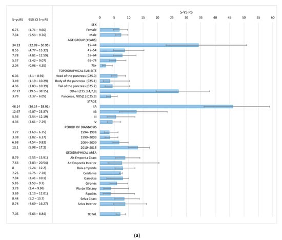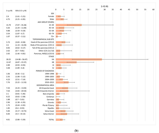 For non-PNETs and non-HC PC, overall 5-year RS was higher in men (4.75%) than in women (2.9%). The survival rate was lower with increasing age, the 5-year RS decreased from 15.79% in young patients (15–44 years) to 1.07% in older patients (75+ years). As for the stage at diagnosis, stage IIA presented the best survival with a 5-year RS of 28.25% (95% CI 14.08; 56.67) and stage IV patients carried the worst 5-year RS: 0.55% (95% CI 0.08; 3.89). Trends in 5-year RS rose from 1.06% (95% CI 0.36; 3.1) in 1994–98 to 7.76% (95% CI 5.22; 11.53) in 2010–15. No differences in survival between the geographical areas studied have been found (Table 4 and Figure 3b).