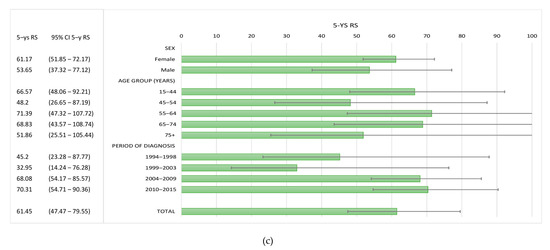 The overall 5-year RS was 7.05% (95% CI: 5.63; 8.84), higher in men (7.34%) than in women (6.75%) (Supplementary Figure S1). The survival rate decreased with advancing age at diagnosis, the 5-year RS dropped from 34.23% in young patients (15–44 years) to 2.04% in older patients (75+ years) (Figure 3 and Figure 4). According to the stage at diagnosis, stage IIA showed a 5-year RS of 46.14% (95% CI 36.14; 58.91) in contrast to the 4.36% (95% CI 2.61; 7.29) of stage IV. Trends in 5-year RS increased from 3.27% (95% CI 1.69; 6.35) in 1994–98 to 13.1% (95% CI 9.98; 17.2) in 2010–15. No differences in survival rates between the geographical areas of Girona province have been found (Table 3 and Figure 3a).