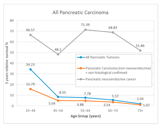 Survival for PC, as reported in the EUROCARE-5 study [10], is particularly low: European average RS is 26% at one year and 7% at five years since diagnosis, similar to what we found in our series (Figure 3). In accordance with previously published data [8], survival decreased with advancing age in our study, except for PNETs, where we found no differences among age groups.