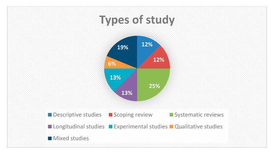 Sixteen articles were selected after the search procedure: 13 were obtained from the bibliographic search and 3 were included by reverse search. Among them were two descriptive studies [10,17] both published in Spain. López and Puente [17] describe the degree of institutionalization of the NCM, while Valverde et al. [10] analyzed the functions and target population of NCM. We also found six literature reviews. Of these, two bibliographic reviews [18,19], carried out in Spain and the USA, respectively) and four systematic reviews [20,21,22,23], the latter is a meta-analysis. Of these studies, one was carried out in the United States [22], two in the United Kingdom [20,23] and one in South Korea [21] (Figure 2). With regard to the longitudinal observational studies, two were obtained from follow-up cohorts served by case management services [24,25]). In addition, we found two experimental studies; a clinical trial [26] and a randomized clinical trial with a control group [27]. In both, it was observed how the activities of the NCM influence the care of patients. One pure qualitative study [28] was retrieved in which 23 nurse case managers in South Korea were interviewed in focus groups and individually. Finally, three studies of mixed methods design were obtained [29,30,31] (Figure 2).