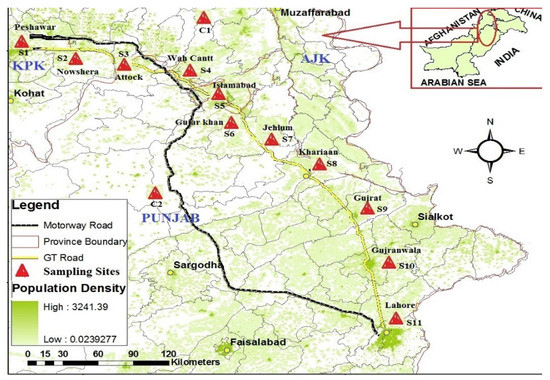 The agricultural belt (approximately 512 km) and the GT road from Peshawar to Lahore were selected as the study areas, which lie between 31°32′–34°02′ N to 74°22′–71°37′ E, shown in Figure 1. The study area consists of two zones based upon land-use type and province boundary, namely, Khyber Pakhtunkhwa (KPK) and Punjab (PNJ). From the KPK zone, three different sites, S1, S2, and S3, were selected for the collection of wheat grains, agricultural soil, and surrounding roadside dust samples, while eight sites were selected from the PNJ zone for a sampling of a similar matrix. Two sites, C1 and C2 (facing the fewest anthropogenic activities), were selected from each zone of the allocated zones, as shown in Table S1 and Figure 1. Selection of respective sites from the allocated zone was grounded upon human activities along the GT road, such as variance in habitat, urbanization, and electronic and solid-waste discarding.