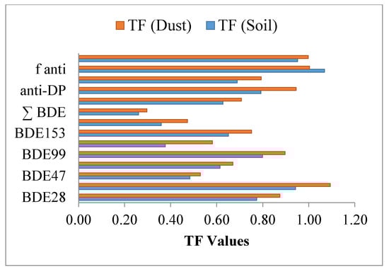 Figure 2. Transfer-factor (TF) values of soil (red) and dust (blue) into wheat for bioaccumulation of target compounds (from BDE28 to f anti).