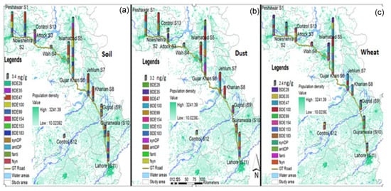 Limited data were published from Pakistan on PBDE and DP contamination in food crops and the environment, and they revealed the existence of this contaminant group in the country [5,6,7,9,11,20]. The current study was designed to investigate PBDE and DP contamination in Pakistani food crops and the environment. Exposure to humans and animals, their probable toxicological impact on human life, source apportionment, and distribution pattern across the Grand Trunk (GT) Road from Lahore to Peshawar (Pakistan) were investigated. Results provide needed information to examine FR exposure pathways and point sources in the study area.