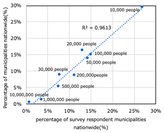 Figure 1 shows the population size by the municipality nationwide (national census, 2015 survey). According to this, it can be seen that 29.4% of all 1741 municipalities have a population size of less than 10,000, and 68.8% have a population of 50,000 or less. In contrast, as shown in Figure 2, the population size by municipality and percentage of survey respondent municipalities nationwide show similar trends. It can be understood then that the results obtained in this paper reflect a national trend.