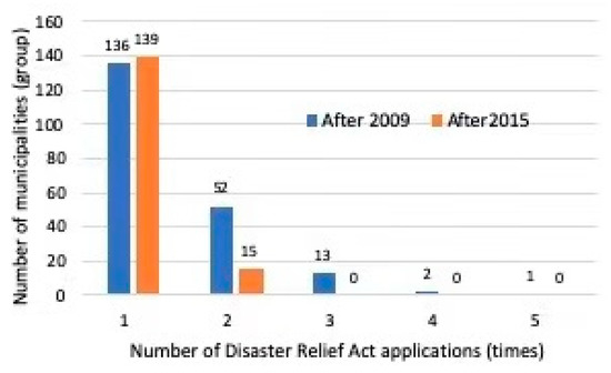 The disaster experience is defined as whether or not the Disaster Relief Act was applied. Here, the Disaster Relief Act’s application status announced by the Cabinet Office is targeted from 2009 to 2015 before this survey. As shown in Figure 4, the number of responding municipalities for which the Disaster Relief Act was applied even once is 204 (about 49% of all responses, 204/413), and there are 136 responding municipalities applied once and one municipality applied it five times, respectively. In addition, the number of municipalities to which the Disaster Relief Act has been applied since 2015 is 154 (about 37% of all responses, 154/413). Comparing after 2009 and after 2015, the number of local governments that applied it one time wass higher after 2015 than after 2019. This is because the number of times is reduced to one when totaled after 2015.