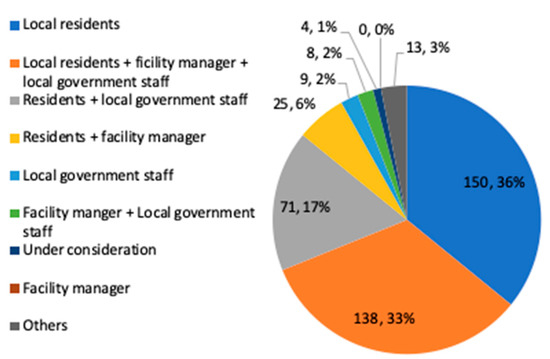Figure 9 shows whether the shelter operating entity includes facility managers. As a result, it was found that less than half of the local governments included facility managers as shelter operating entities. In the descriptive free answer, there was an opinion that “there may be no knowledge about the facility without the facility manager.” Therefore, it is thought that the operation work will be more efficient with the facility manager’s involvement who is familiar with the facility.
