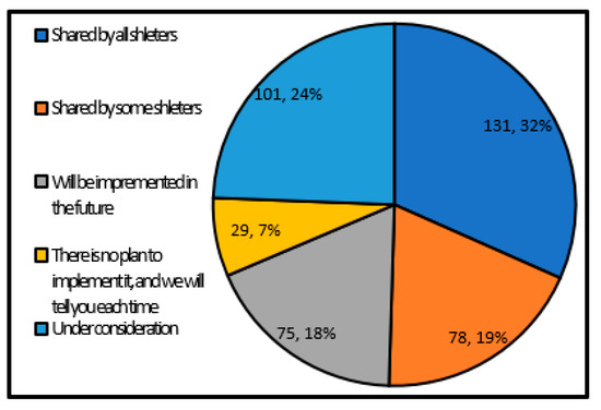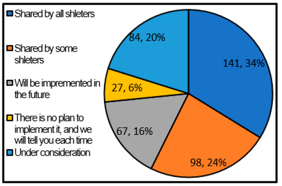 Figure 10 shows whether or not the local government’s concept is made known to the concerned parties (local residents, facility managers, etc.), and the recognition is shared regarding the shelter operating entity. As a result, 34% of the local governments answered that they shared their awareness of all shelters, and 24% of the local governments that answered that they shared their awareness of some shelters. Therefore, the local governments that share recognition with even some shelters was about half (58%). It became clear that this is different from the fact that more than 90% of local governments are assuming the participation of local residents as the operating entity. As a method of communicating the recognition of the municipality to the residents, it is conceivable to create a manual of shelter management in cooperation with the residents. However, according to Ariyoshi et al. [8], the rate of creating manuals in collaboration with residents is low, and it can be said that many local governments have not been able to disseminate the recognition and knowledge necessary for independent shelter management to residents through the creation. This study is consistent with this. In addition, from the local governments that have actually opened shelters, there were opinions such as “too few residents are aware that they are the operating entity of shelters.”, “Evacuees think shelter management are all administrative work. (Lack of self-help)”, and “The evacuees themselves recognize that they are customers”. These are considered to be due to the lack of sharing of awareness regarding the shelter operating entity.