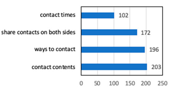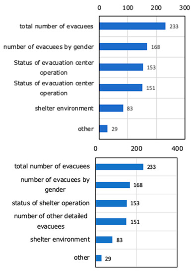 Figure 14 shows the contents of the information-sharing system. Of the local governments that specify information sharing with the disaster response headquarters, the number of the local governments that specify the contact times (at the time of opening/morning/evening, etc.) are less than that of the local governments that set the ways to contact and contact contents and share contacts to both sides. For information sharing, most local governments create assessment sheets of shelters in disaster prevention plan or manuals for shelters [23,24], but it is likely that the contents of assessment sheets are not enough.